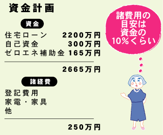 『我が家づくり』では、ゼロエネ補助金を含めて2665万円の資金から諸費用250万円を引いた2415万円を住宅+外構に充当する計画を立てました。(無理なくローンで払える範囲で)
